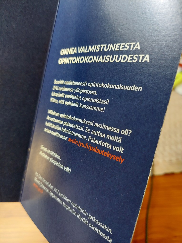 Uuden yrityksen kirjallisuuden opintoihin aloitin juuri ennen kuin päädyin äidinkielen opettajaksi Suomen Liikemiesten Kauppaopistoon (nyk. Business College Helsinki) syksyllä 2015. Tuolloin kävin kahdella Helsingin yliopiston perusopintokurssilla, joista ensimmäisen tentissä jouduin suulliseen täydennykseen ja toisesta sain puhtaan hylätyn. Ei kauhean vahva ollut siis uusikaan yritys, joten häivyin matkoihini. Tämä ei suinkaan johtunut opettajasta, sillä sain kunnian olla viimeistä vuotta yliopistolla toimineen emeritusprofessori Hannu Riikosen opissa. Riikonen kuului niiden tunnettujen minuakin opettaneiden professoreiden joukkoon yhdessä Lappeenrannan teknillisen yliopiston johtamisen ja organisaatioiden emeritusprofessori Pauli Juutin ja kaupunkitaloustieteen emeritusprofessori Heikki A. Loikkasen kanssa. Jotenkin oma möhlimiseni opinnoissa jäi kaivelemaan, ja ammatillisen opettajan pedagogisia opintoja Haaga-Helian Ammatillisessa opettajakorkeakoulussa tehdessäni havaitsin, etten lopulta olekaan kovin kaukana myöskään äidinkielen ja kirjallisuuden opettajapätevyydestä. Niinpä muutaman vuoden asiaa sulateltuani löysin itseni Jyväskylän yliopiston avoimesta yliopistosta koronakeväällä 2020 ilmoittautuneena suorittamaan ensimmäisiä kirjallisuuden perusopintokursseja – sen yhden ainoan suullisella täydennyksellä Helsingissä läpi saamani kurssin lisäksi. Yllätyksekseni opinnot tuntuivatkin aiempia yrityksiäni mukavammilta, ja tuntui, että jaksoin keskittyä aiempaa paremmin tekemiseeni. Niinpä lopulta onnistuin kuin onnistuinkin kumoamaan ennakkokäsitykseni itsestäni kirjallisuuden opiskelijana, ja omat kurssityöni tuntuivat itsestänikin erittäin laadukkailta. Niinpä saatuani langanpäästä kiinni paransin kaiken aikaa, ja lopuista kurssitöistäni sain peräti täysiä viitosia. Lopulliseksi kokonaisarvosanaksi muodostuikin kiitettävä 4. Tänään sain päiväpostissa Jyväskylän yliopistosta todistuksen suoritetusta opintokokonaisuudesta, opintosuoritusotteen sekä kuvassa näkyvän onnittelu- ja kiitoskortin. Ne ilahduttivat minua kovasti, sillä kotiyliopistossani Helsingin yliopistossa opintokokonaisuuksien valmistumista ei ole ollut tapana huomioida erityisemmin minkäänlaisilla todistuksilla puhumattakaan korteista. Olen kai vähän vanhanaikainen, mutta minusta on kivaa saada ihan kunnolliselle juhlavalle paperille kirjoitettu todistus suoritetuista opinnoista.