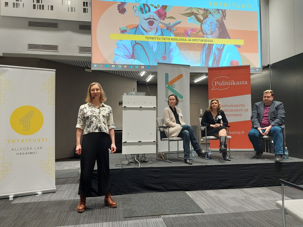 Päivän alkajaisiksi osallistuin kuulijana paneelikeskusteluun, jonka aiheena oli Yleistajuisen tiedeviestinnän potentiaali opettajien työssä, jossa keskustelijoina toimivat Johanna Katsomukset.fi-sivuston edustajana, Politiikasta-tiedeverkkolehden päätoimittaja Mikko Poutanen, Raili Keränen-Pantsu kenties Uskonnonopetus.fi-sivustolta sekä Miia Halme-Tuomisaari Tutkitusti.-sivuston edustajana ja paneelin vetäjänä. Keskustelun ydintä oli muun muassa se, millä tavoin tutkittua tietoa voidaan kansantajuistaa ja tuoda aiempaa tehokkaammin kansalaisten ulottuville.